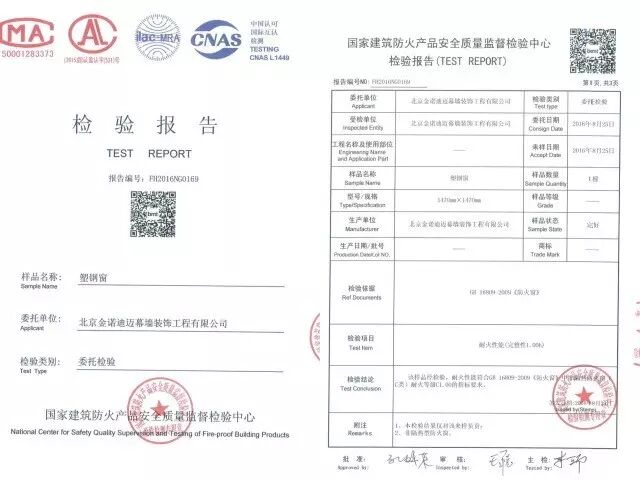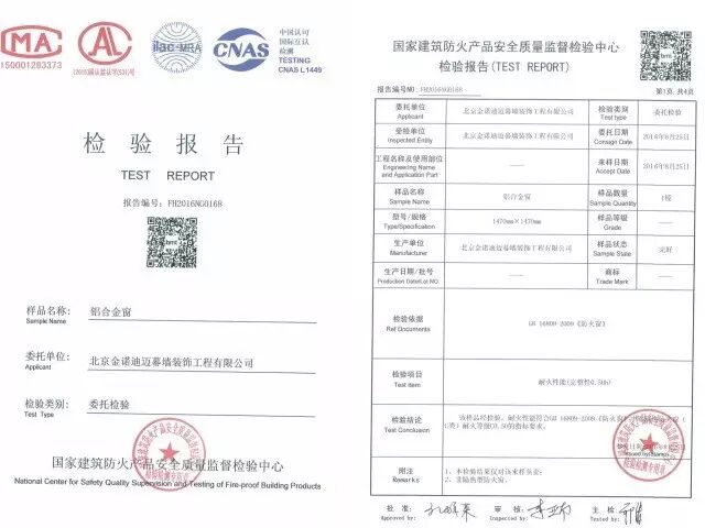 为了满足这一要求,金诺迪迈研发团队通过不懈努力,成功研发出了平开窗结构的耐火窗,并且一次性通过了国家级别的检验中心的检验,成为行业内首批通过国家建筑工程质量监督检验中心外窗耐火完整性0.5小时和1.0小时的性能检测,产品性能满足《建筑设计防火规范》中对建筑外窗耐火性能的强制性要求,为公司承接耐火窗工程奠定了坚实的基础。